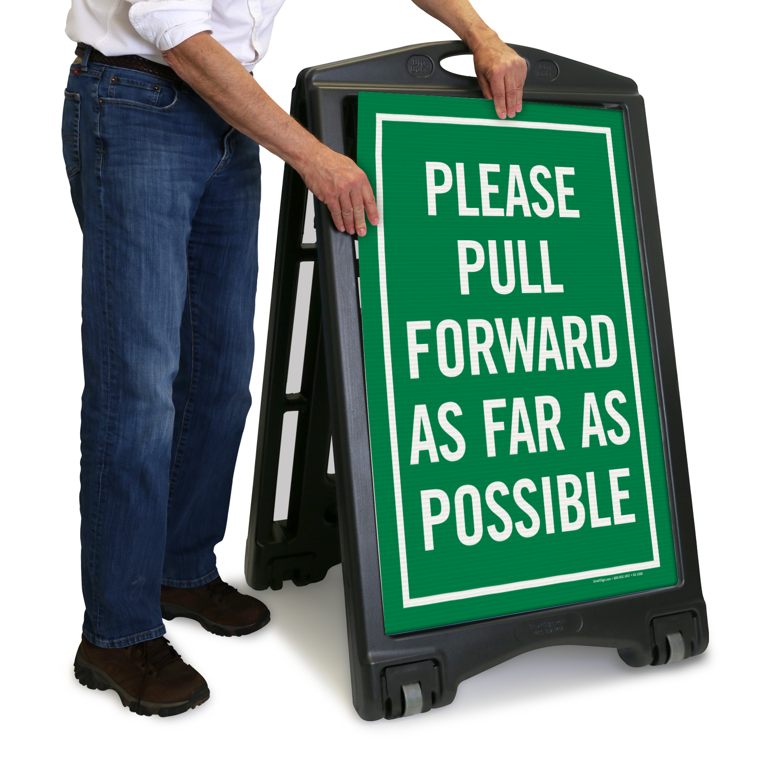 Use this portable A-Frame Sidewalk Sign Kit to remind drivers to pull their vehicle forward as much as possible to the next stopped car before stopping..