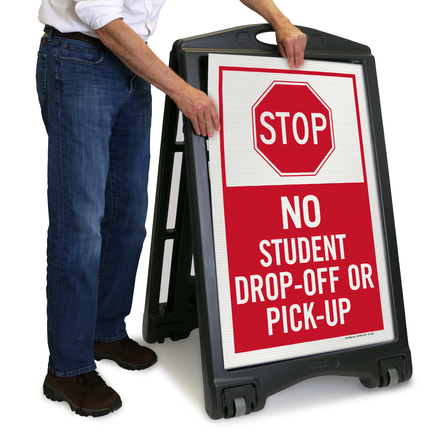 Use this portable A-Frame Sidewalk Sign Kit to inform parents or drivers about the area where student drop-off or pick-up is prohibited.