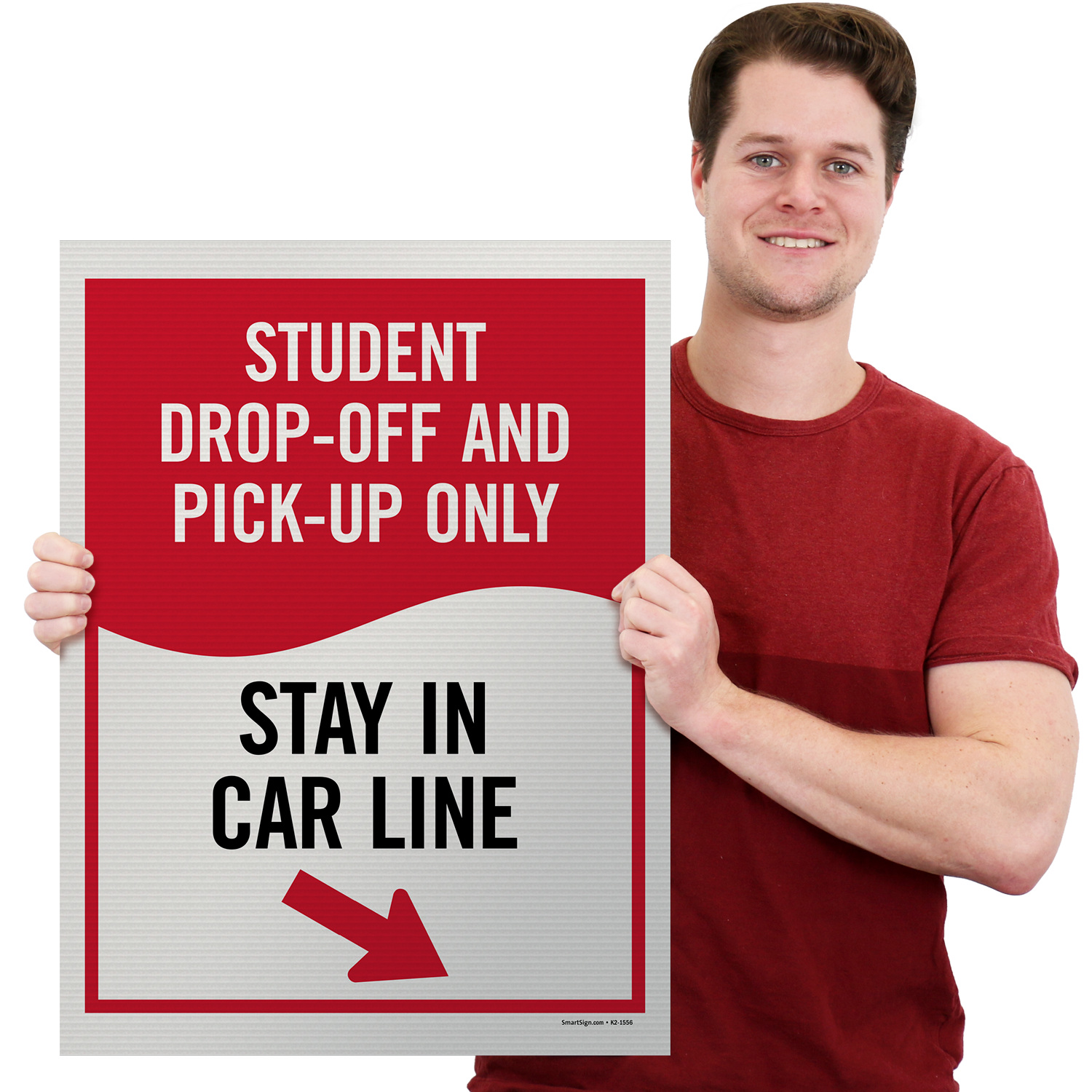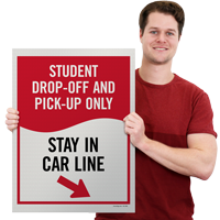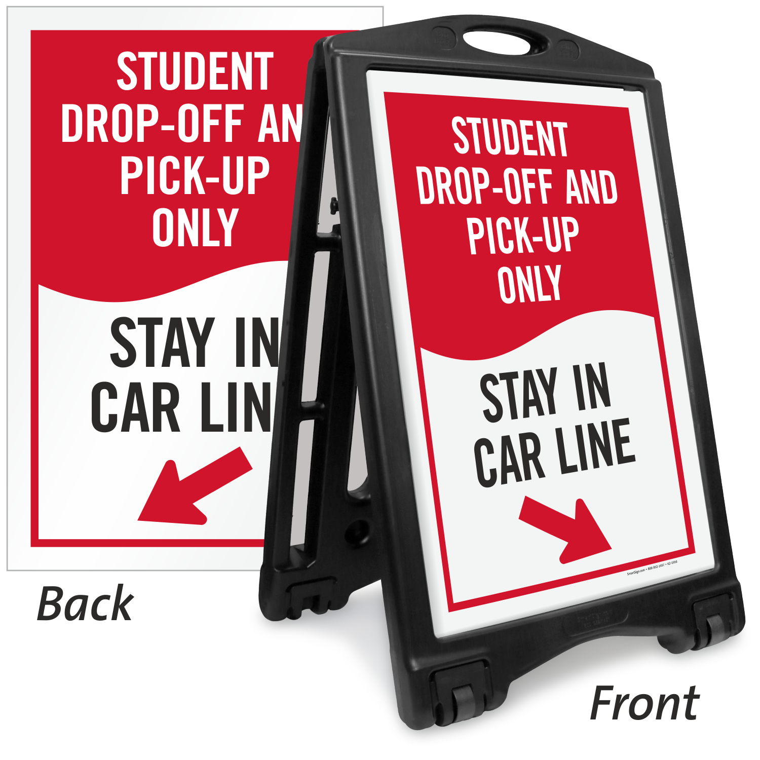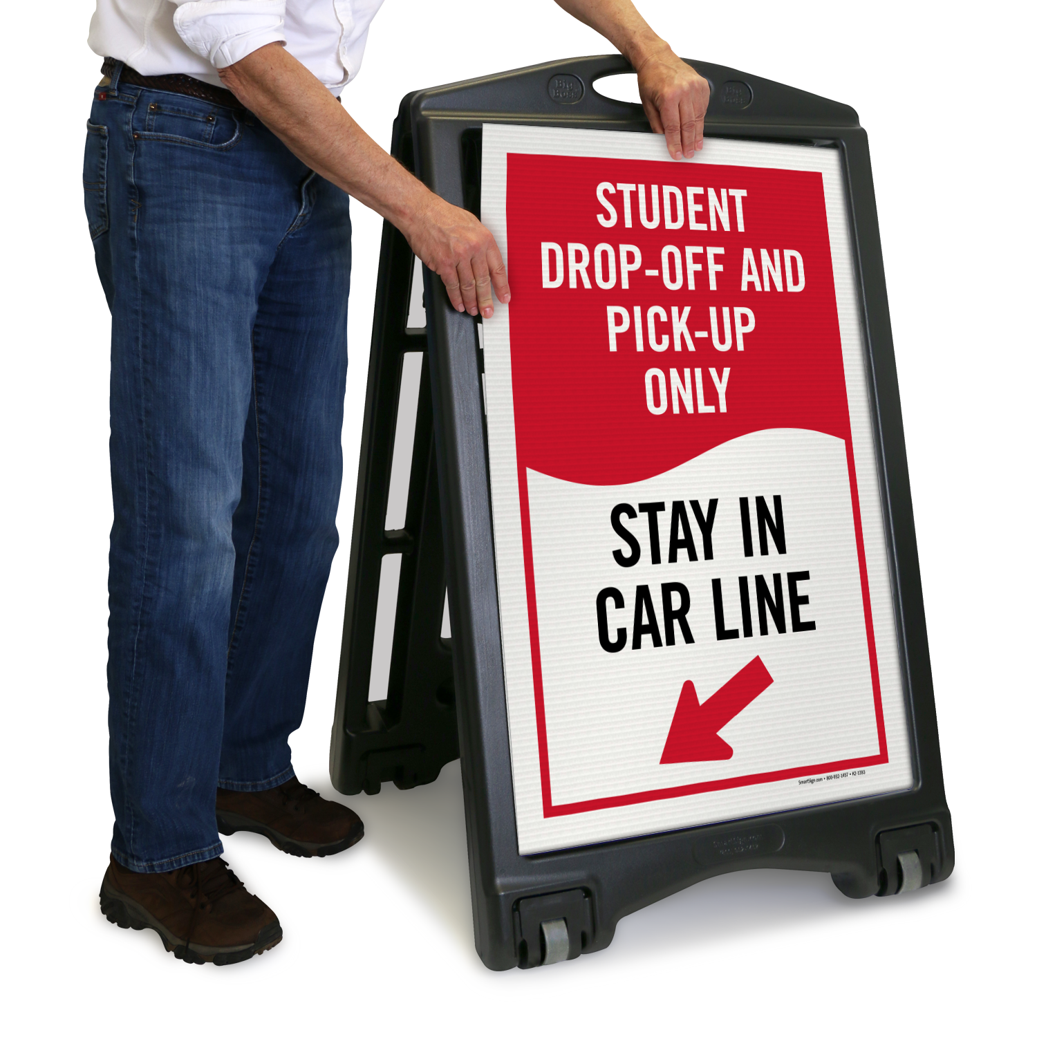 Use this portable A-Frame Sidewalk Sign Kit to inform drivers about the area towards left which is designated only for Student Drop-Off and Pick-Up and to stay in the car line to reduce traffic congestion.