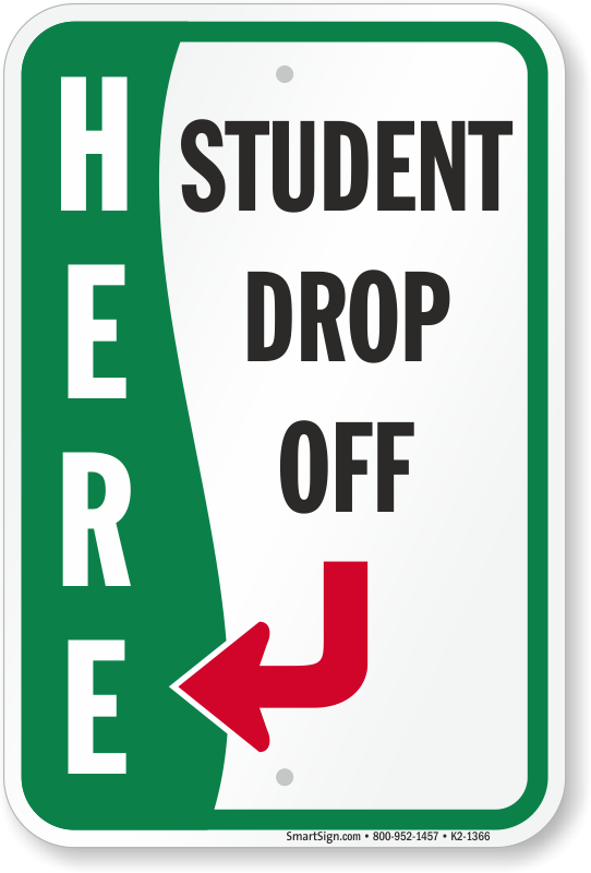 Drop-Off Sign: Here, Student Drop-Off with towards Left Arrow K2-1366 Learn More...