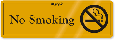 A crisp No Smoking Sign made from best quality aluminum. This isn't just a premium gold colored door sign though; it also has the durability to withstand at-door abuse and lots off traffic.