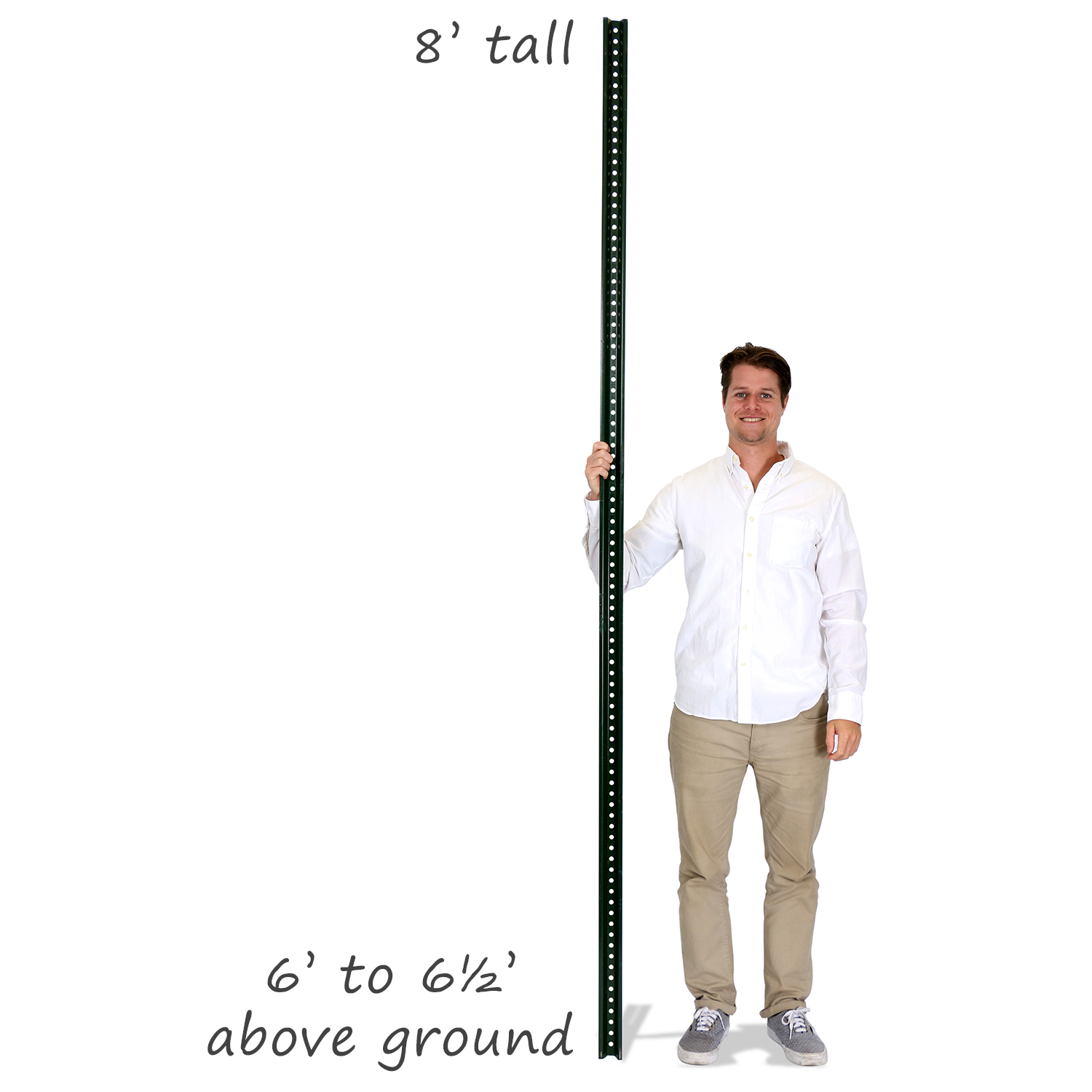 8' tall posts are made of medium weight steel with a baked-on green coating that protects the post from rusting.