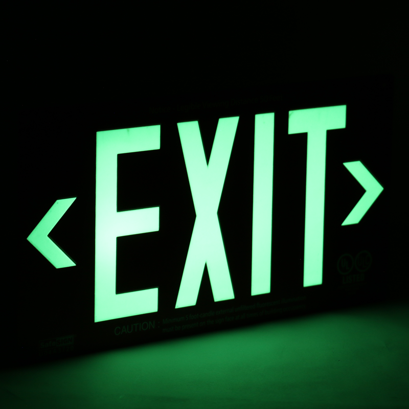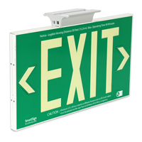 • Strontium Oxide Aluminum is blended with acrylic for maximum, long-lasting photoluminescence. Sign face absorbs light and glows in the dark when the lights go out. Perfect for when an electrical emergency occurs - no wires to hook up. • Meets UL 924 standards for visibility and mechanical construction. Sign will glow for over 90 minutes in a blackout situation. • Provided with a Universal Mounting Bracket for ceiling & side mount installations. Sign comes with all necessary hardware to mount your sign the day you get it. Kit also includes 2 twist-on wire connectors to cover exposed wires from an old electrical exit sign. • Sign includes 2 metal snap-on-chevrons. Metal chevrons are superior to adhesive chevrons used on other exit signs. Adhesive chevrons can be easily peeled off, while metal chevrons are secure. Simply snap in the appropriate arrow to direct traffic to the closest exit.