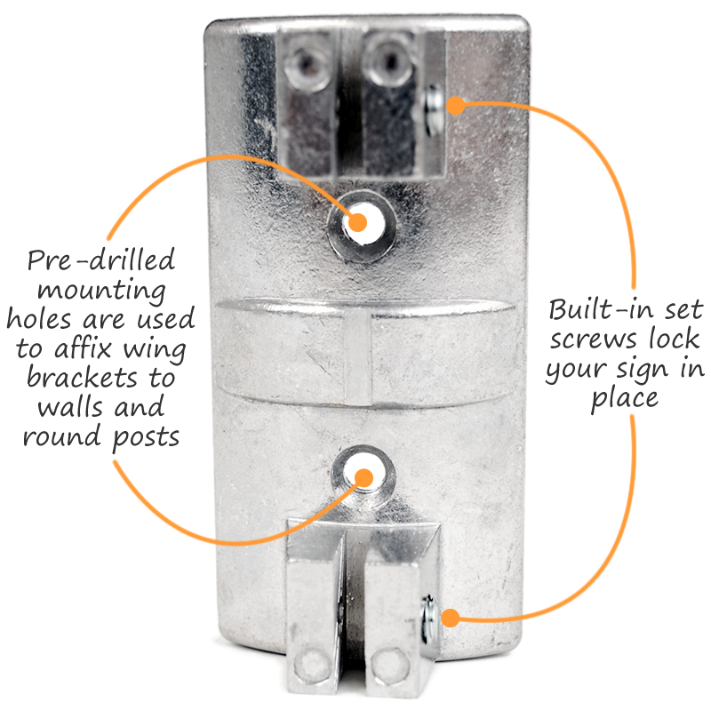 • Perfect for mounting on the side of any building, alley or post. Predrilled holes are 1/4" in diameter . • Brackets are made from a sturdy cast aluminum. They will not rust. • Two brackets are used for most sign sizes (such as a 12” x 12” or 12” x 18” sign). • Wing brackets hold signs in place with internal set screws, so no extra sign holes are required! • Use on round or square posts.