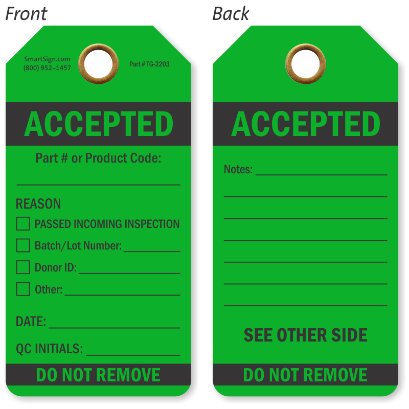 This vertically aligned double-sided tag in green makes sure 'Accepted' products are marked well.