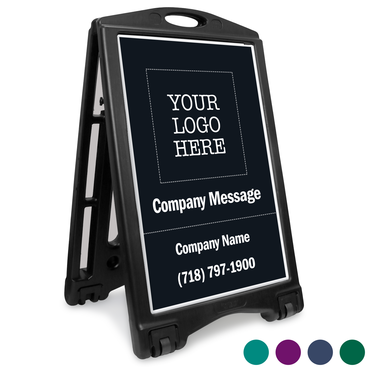 Each BigBoss kit includes two corrugated plastic custom sign panels and a frame with built-in wheels. Customization allows you to add your logo, text, and company name and contact.