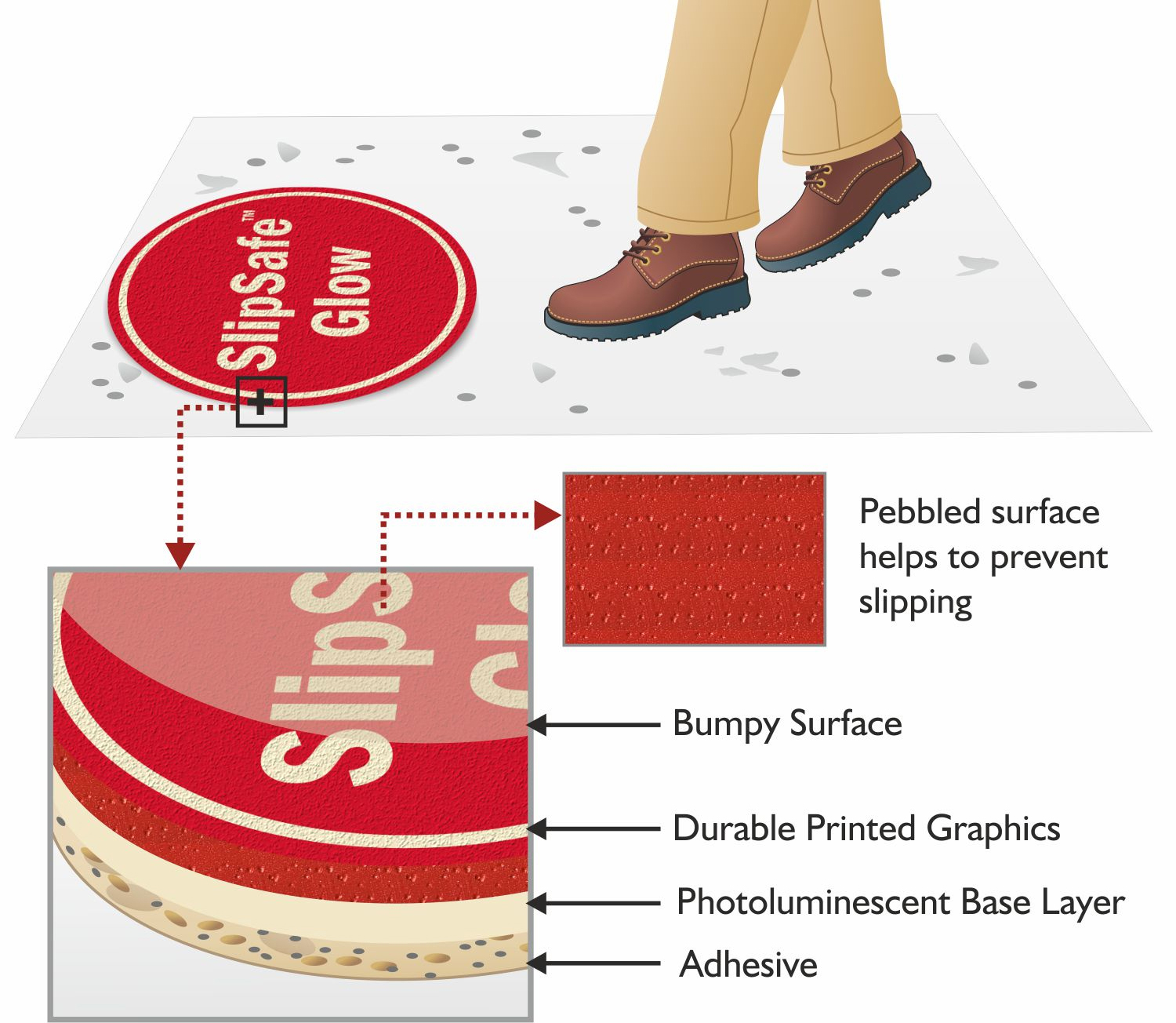 You may go for our SlipSafe™ Glow floor signs that combine photoluminescence with an anti-skid, “pebbly” surface. These signs absorb both natural and artificial light and use it to glow during a blackout or other low-light conditions. This makes these decals perfect for emergencies, evacuations, and fires.