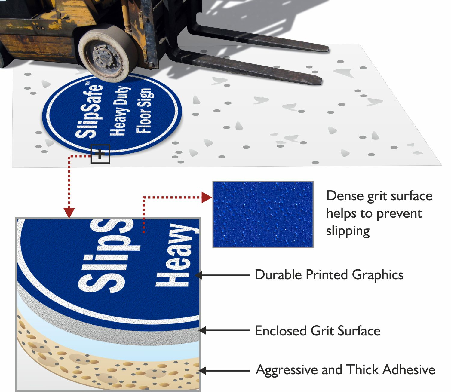 • 18 mil thick, anti-skid vinyl floor sign with enclosed grit top surface and permanent adhesive backing.