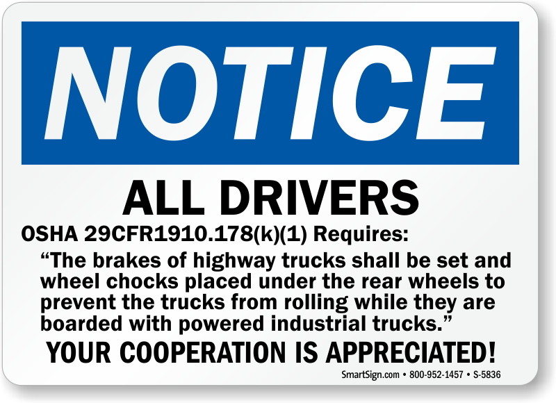Be sure that all truck drivers are responsible and perform necessary safety steps. Post this OSHA Notice Sign and make the requirements clear.