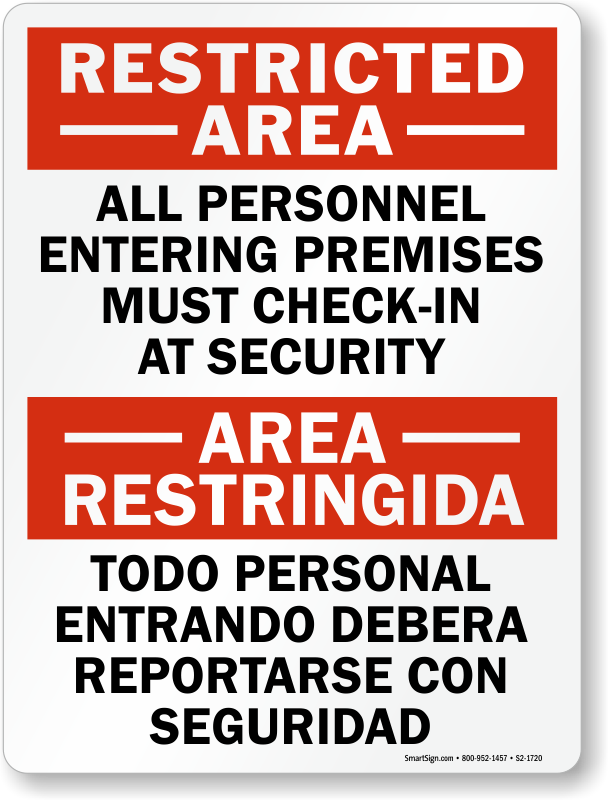 Bilingual Restricted Area Sign: All Personnel Entering Premises Must Check-In At Security / Todo Personal Entrando Debera Reportarse Con Seguridad (English/Spanish) S2-1720