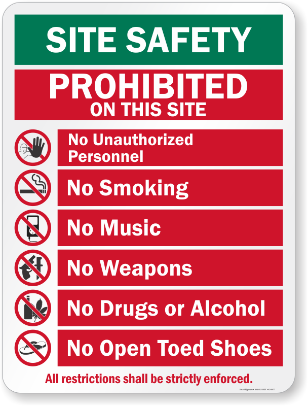 Set out your rules on your property. This Site Safety Sign enlists all those things prohibited on the site along with their graphics for a better understanding.