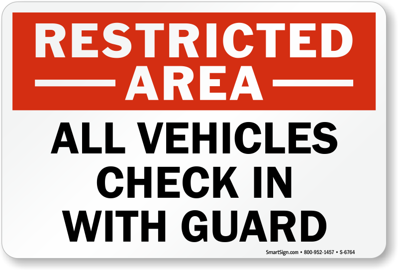 This Restricted Area Sign clearly informs drivers that all vehicles must check in with the guard before entering the zone.