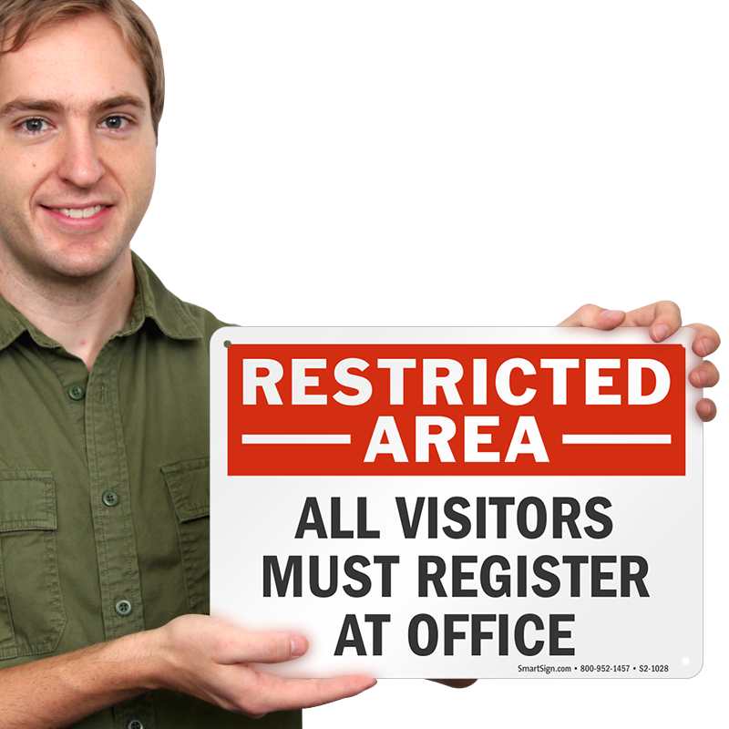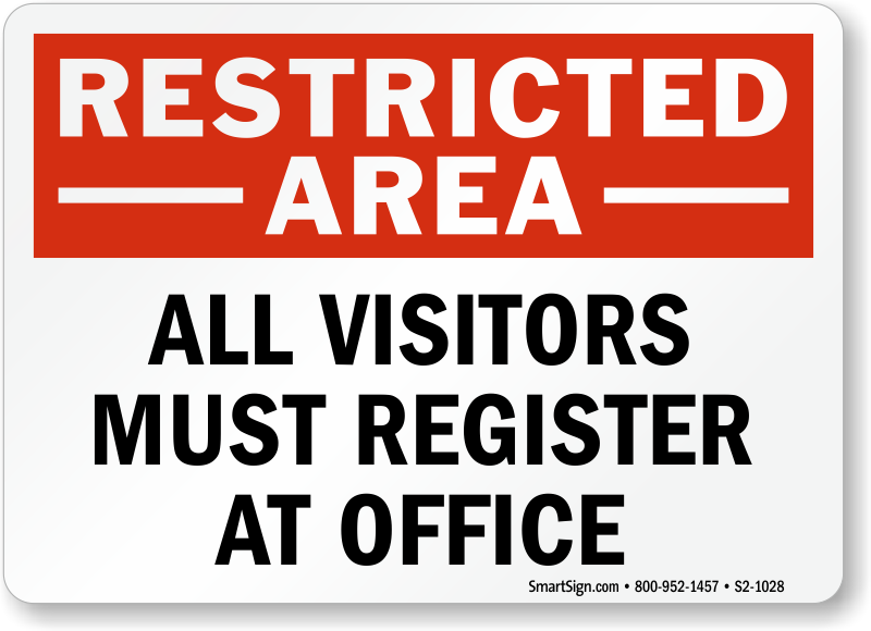 Restricted Area Sign: All Visitors Register At Office S2-1028