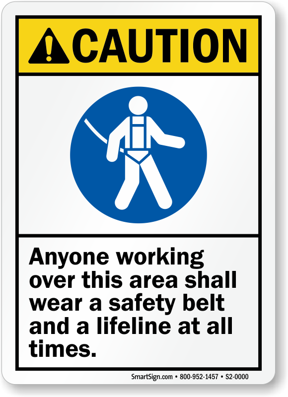 ANSI Caution Sign: Anyone Working Over This Area Shall Wear A Safety Belt And A Lifeline At All Times. (With Graphic)