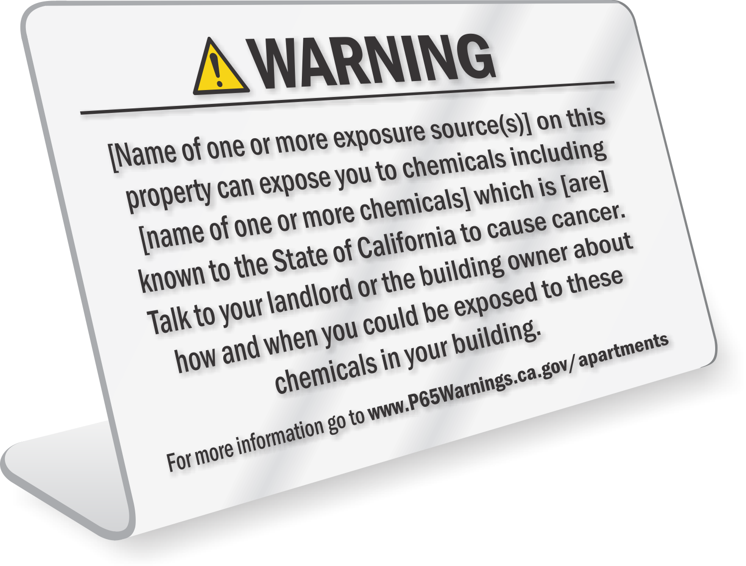 Custom California Prop 65 Desktop Sign: Warning - Entering This Area Can Expose You To Chemicals Known To The State Of California To Cause Cancer Learn More...