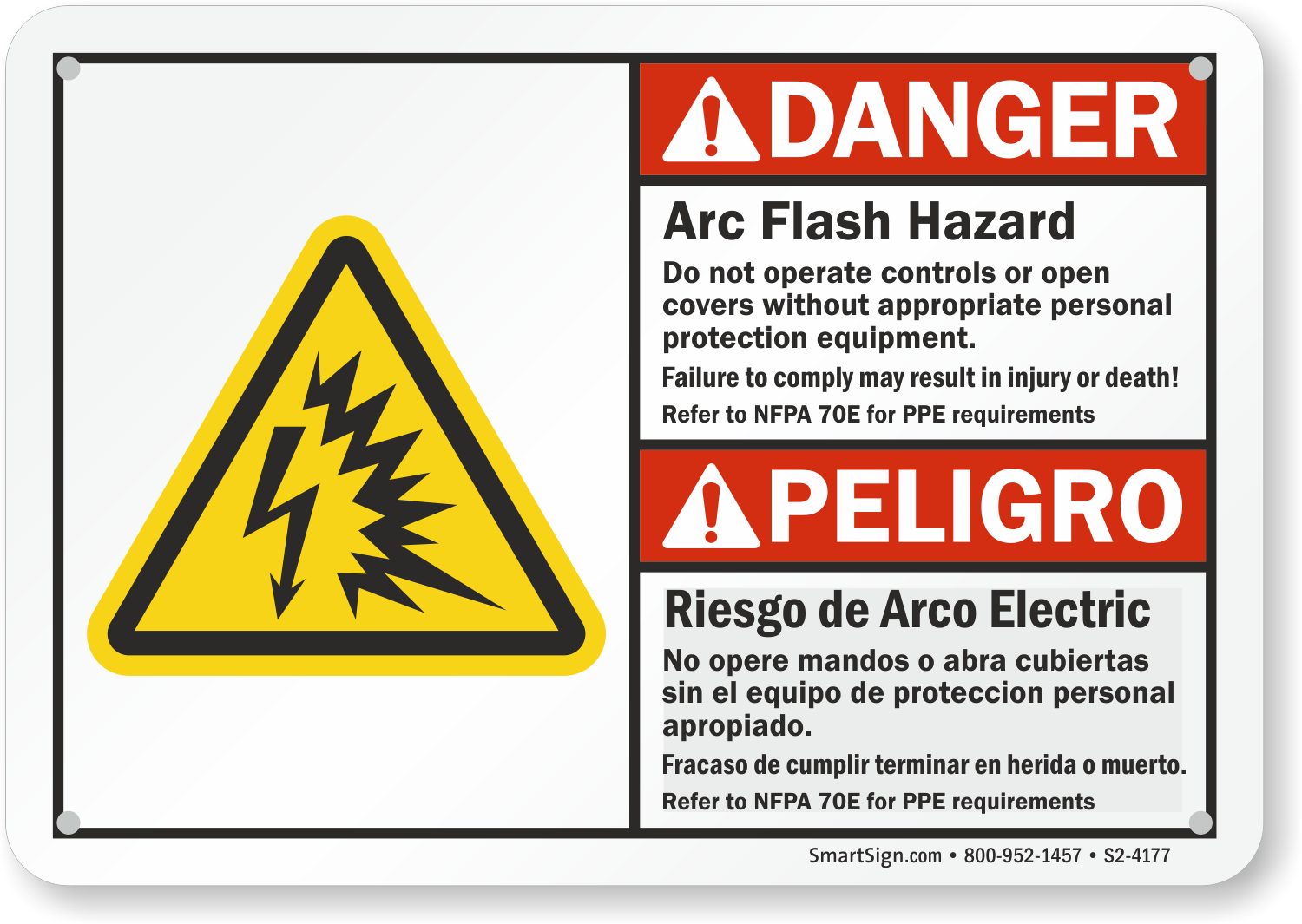 ANSI Danger Sign: Arc Flash Hazard - Do no operate controls or open covers without ppe (English & Spanish) Learn More...