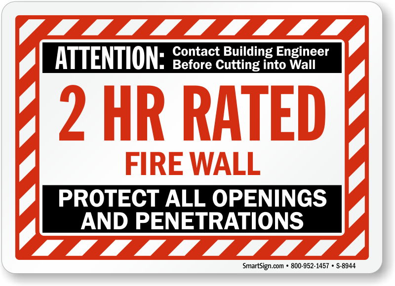 A fire wall sign provides important information about fire resistance of a wall in the building and alerts people to contact building engineer before cutting into the wall. Striped border grabs attention and bold text can be read from afar.