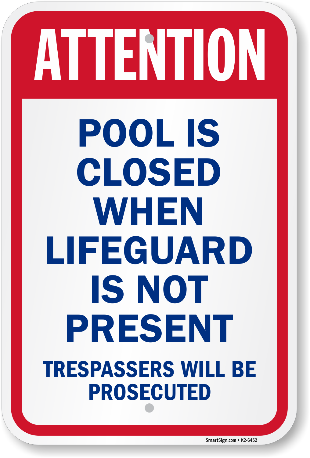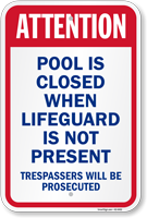 Attention - Pool Is Closed When Lifeguard Is Not Present, Trespassers Will Be Prosecuted Sign helps reduce your liability if someone does get hurt or drown.