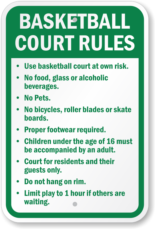 Basketball Court Rules Sign: Use Basketball Court At Own Risk, No Food, No pets, No Bicycles, Proper Footwear Required K-0156 Learn More...