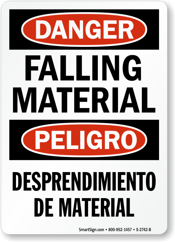 Address a multicultural workforce with this Falling Material / Desprendimiento De Material Sign. Bilingual signs are helpful.