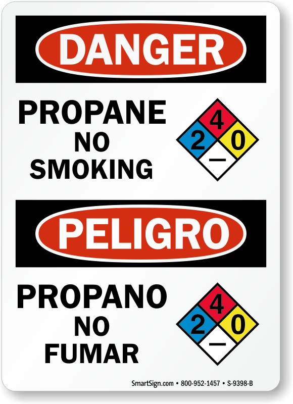 In a diverse workforce, bilingual sign ensures that language barrier does not impede communication of safety message. This Bilingual OSHA Danger sign with a NFPA symbol prohibits smoking in the area of Propane.