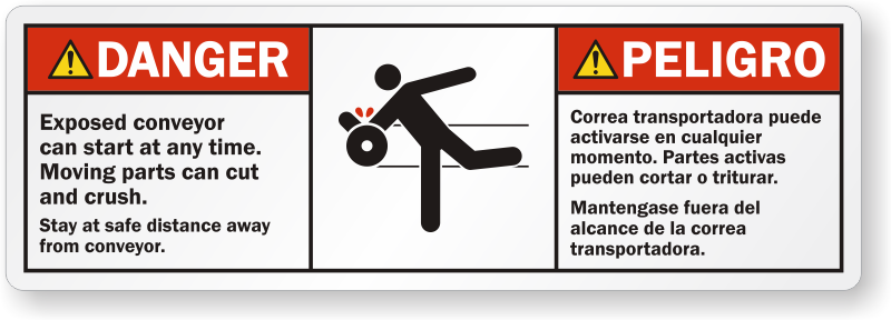 This ANSI label is best suited to inform workers to be wary of the exposed conveyor as it can start at any time and that the moving parts can cause fatal physical injuries. This graphic enabled label warns in two languages.