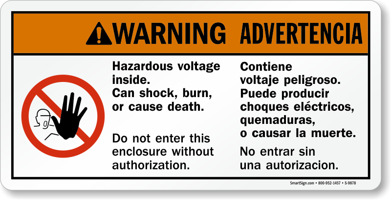 Sometimes people can forget that high voltage is hazardous and can shock, burn, or cause death. Use this bilingual warning sign to remind others that it's best not to enter a dangerous enclosure without authorization.