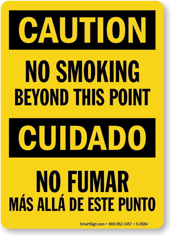 Bilingual OSHA Caution sign displays your message in both English and Spanish. This sign marks your 'No Smoking' area limits.