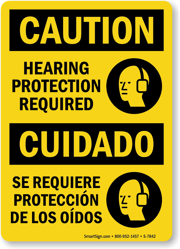 Simply instruct in two languages that hearing protection is required at the workplace to ensure safety of the workers.