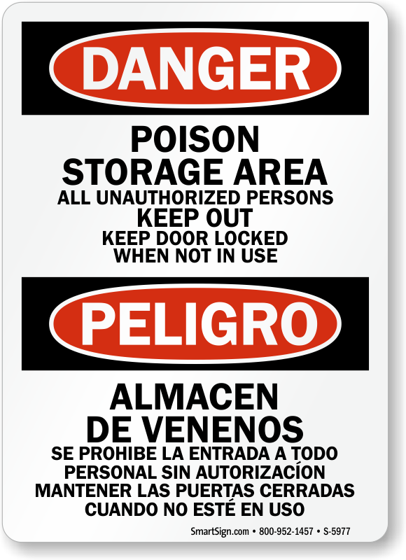 Let people know of the Poison Storage Area. Bilingual messages allow more people to read and understand the sign.