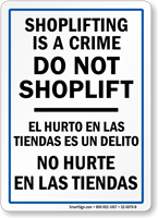 Great for stores catering a multi-cultural customer base, this sign has a strict message for shoplifters in English as well as Spanish.