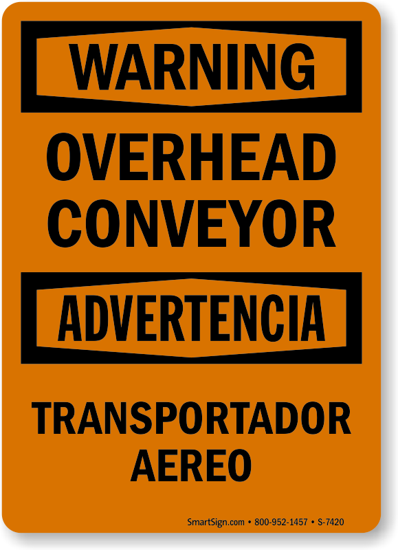 A bilingual sign will warn a much wider audience. Use this Warning sign to alert everyone about the Overhead Conveyor.