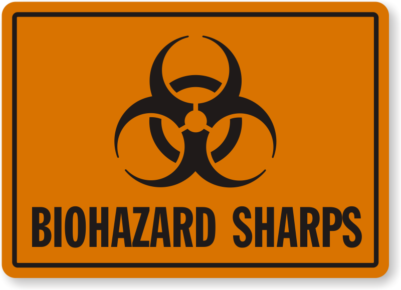 Biohazard sharps should never be collected in a regular trashcan or dumpster. They should always be collected in separate containers. Mark these containers with this biohazard label.