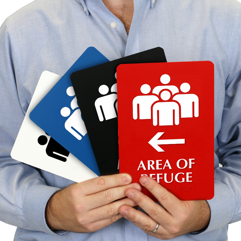 Communicate the area of refuge by using this 9" x 6" TactileTouch™ Braille sign with an assembly point pictogram.