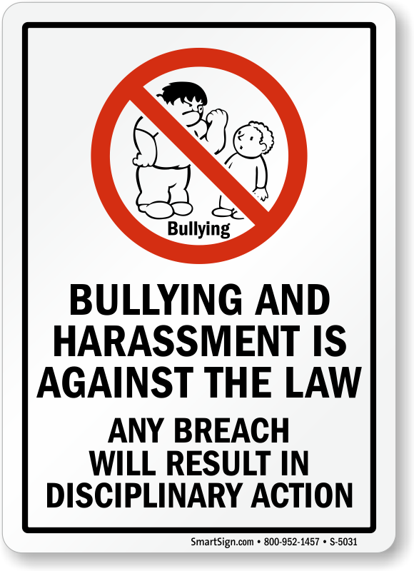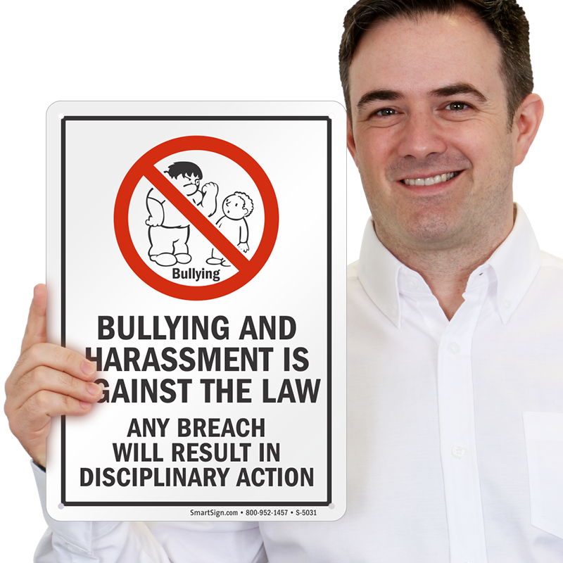 Discourage bullying and tell everyone that bullying and harassment is against the law. Great for schools, this No Bullying sign clearly states that breach of rules will call for disciplinary action.