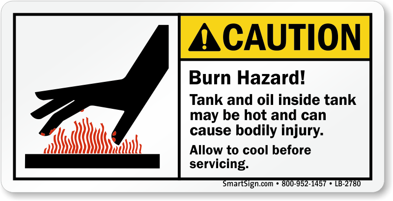 ANSI Caution Safety Label: Burn Hazard! Tank And Oil Inside Tank May Be Hot And Can Cause Bodily Injury Allow To Cool Before Servicing (With Graphic) LB-2780