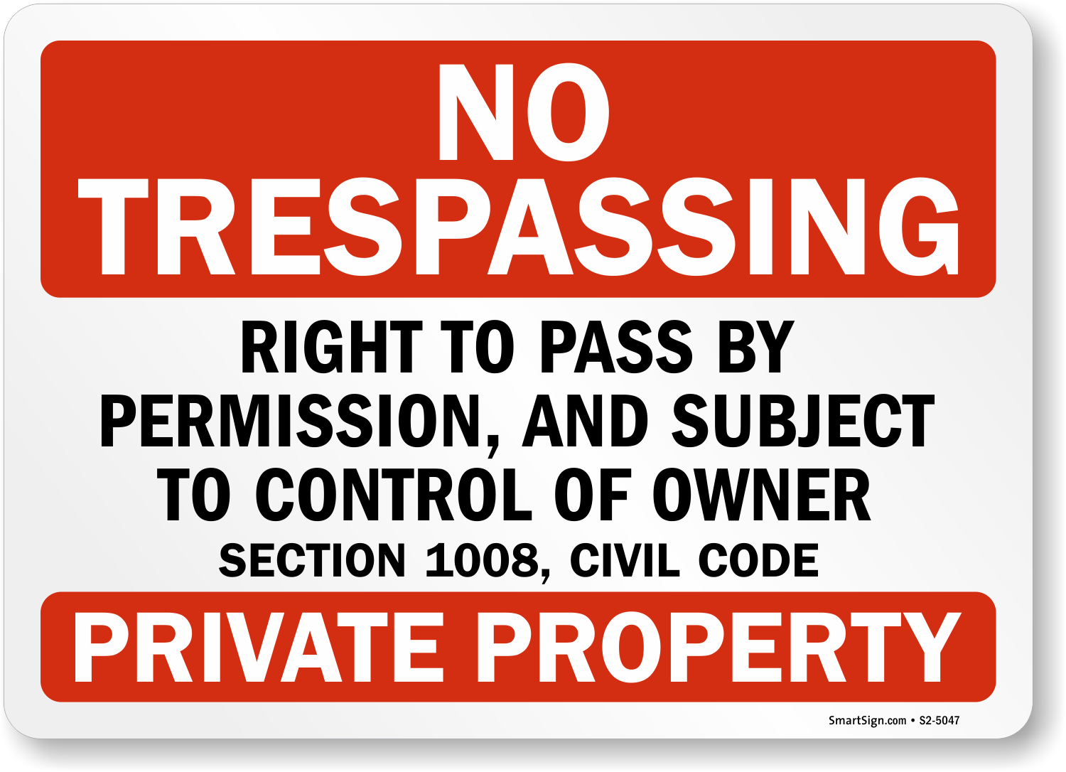 Official California No Trespassing Sign: Right To Pass By Permission, And Subject To Control Of Owner - Section 1008 Civil Code, Private Property S2-5047