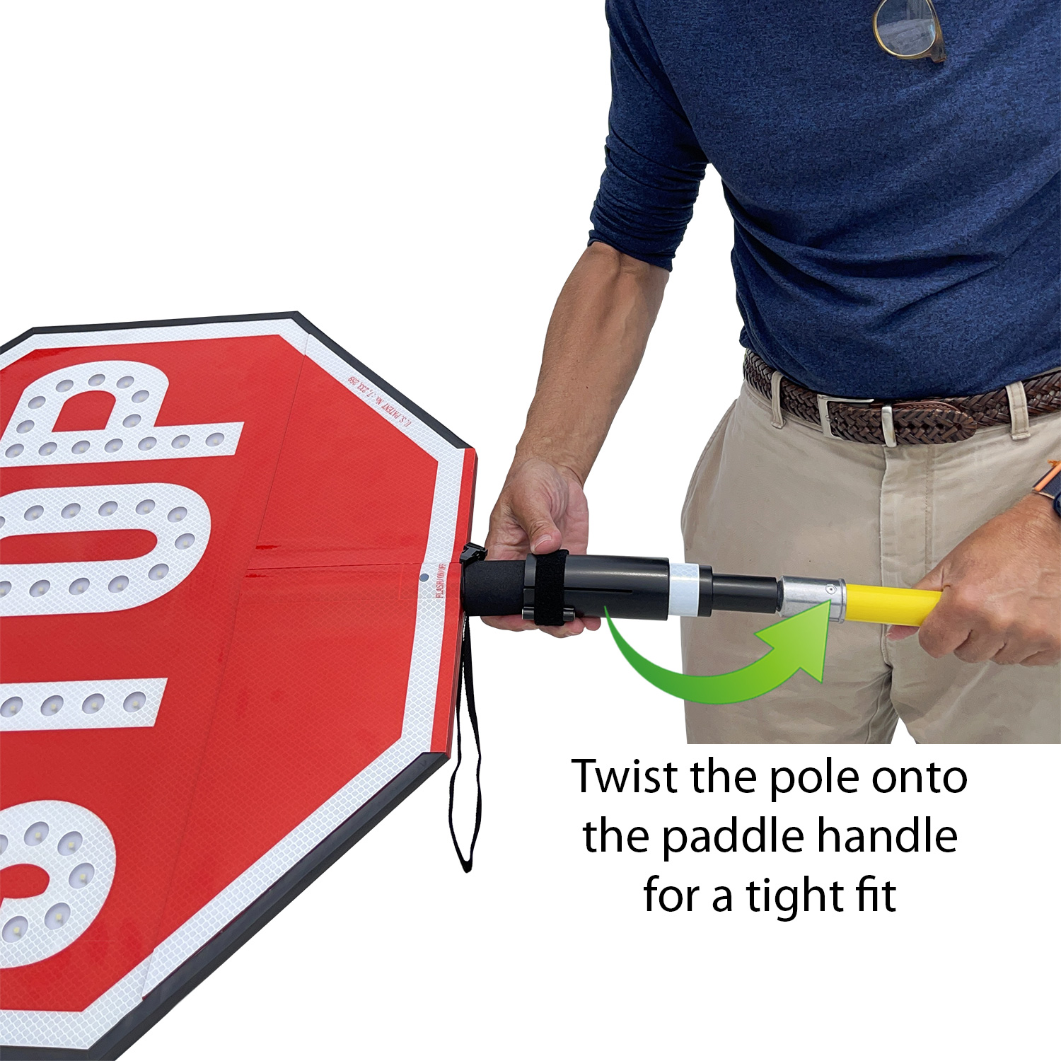 - Foam grip handle and lightweight design increases comfort and keeps your personnel alert for any safety situation. Sign and battery pack weigh about 2.3 lbs. Paddles come with a rechargeable battery and charger. Sign will last 3.5 hours on steady LED light or 6.5 hours on flashing LED light.