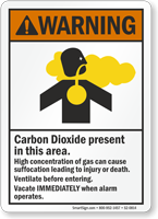 ANSI Warning Sign: Carbon Dioxide Present, Gas Can Cause Suffocation, Ventilate Before Entering S2-0814