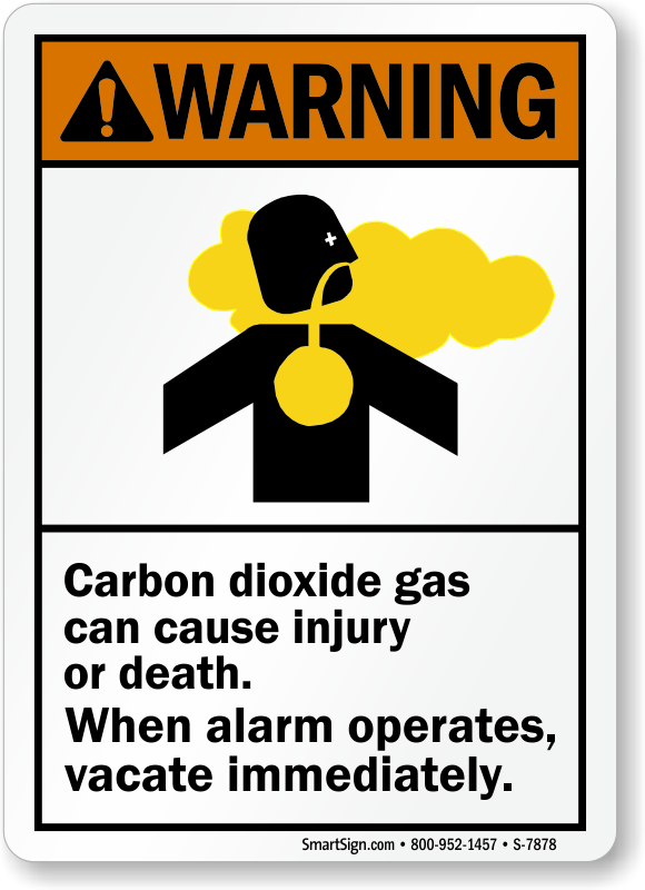 ANSI Warning Sign: Carbon Dioxide Gas Can Cause Injury Or Death. When Alarm Operates, Vacate Immediately S-7878