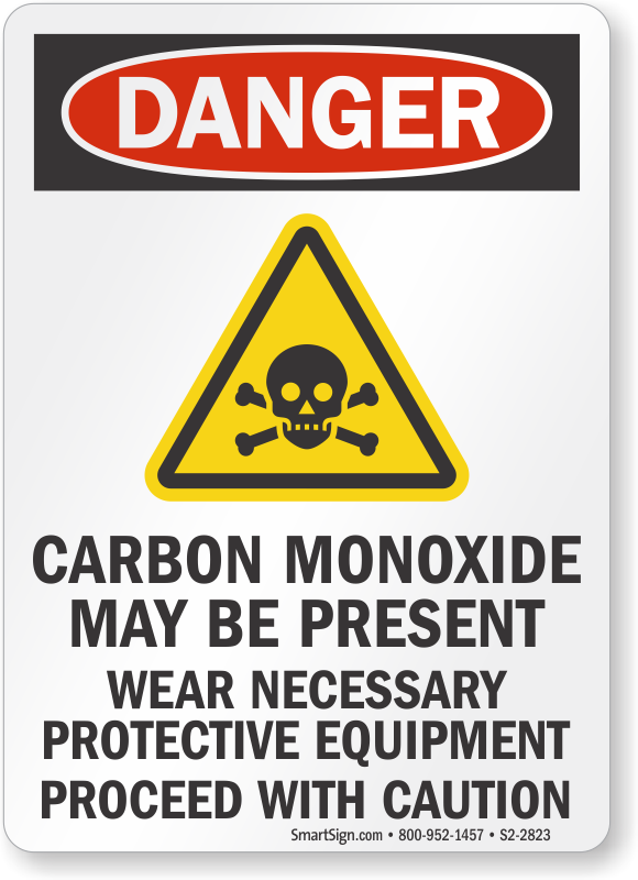 OSHA Danger Sign: Carbon Monoxide May Be Present, Wear Necessary Protective Equipment, Proceed With Caution