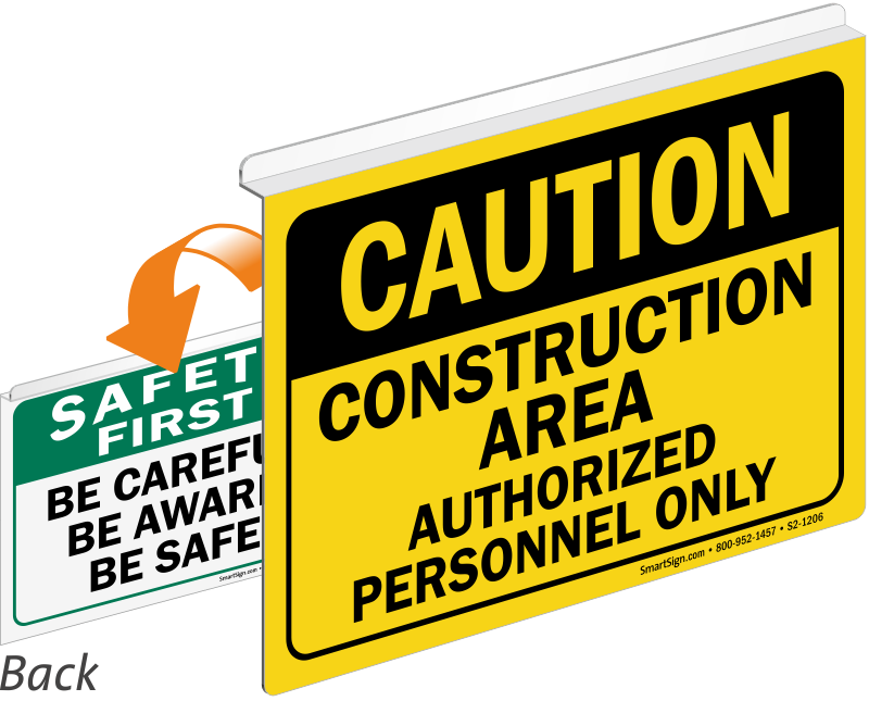 Z-Sign for Ceiling (2-Sided): Caution - Construction Area, Authorized Personnel Only (Front) / Safety First - Be Careful Aware Safe (Back)