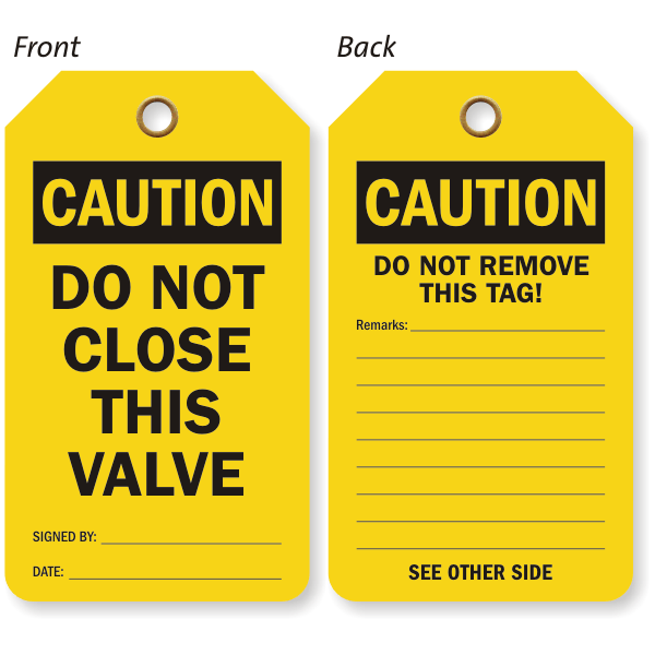 2-Sided OSHA Caution Safety Tag: Do Not Close This Valve Do Not Remove This Tag TG-0587