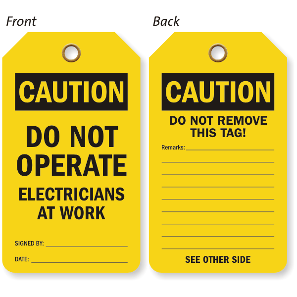 If your electricians are at work, don't take their safety for granted. This effective Two Sided OSHA Caution Safety Tag can prevent workers from unknowingly operating equipment under repair.