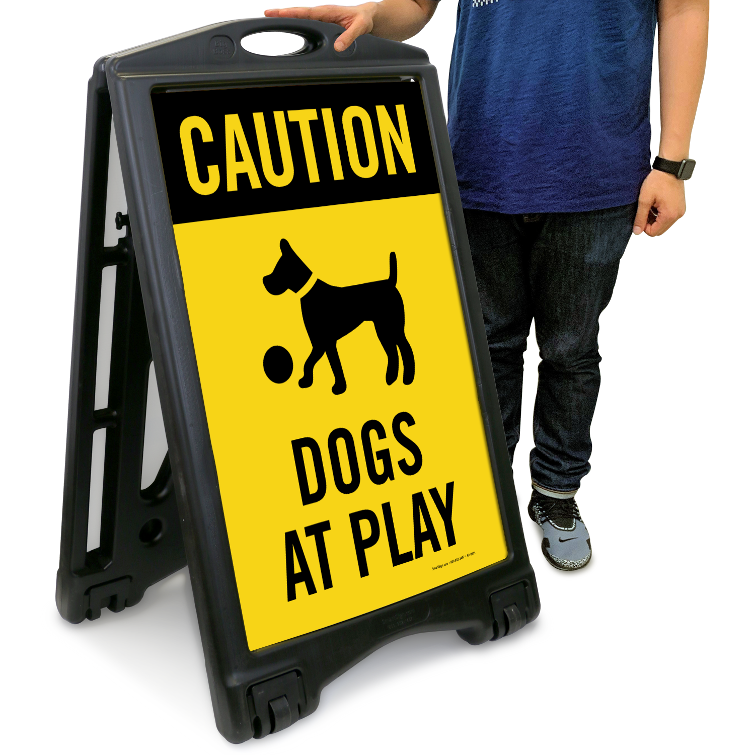 Prevent accidents by alerting drivers around pet-friendly areas with this Dogs At Play sign panel. Display your message on this side panel slid into a portable A-frame sidewalk sign.