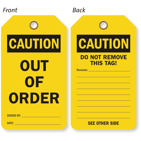Out of order machines should be marked properly so that no one mistakenly starts working on them. This 2-Sided OSHA Caution Safety Tag will serve the purpose.