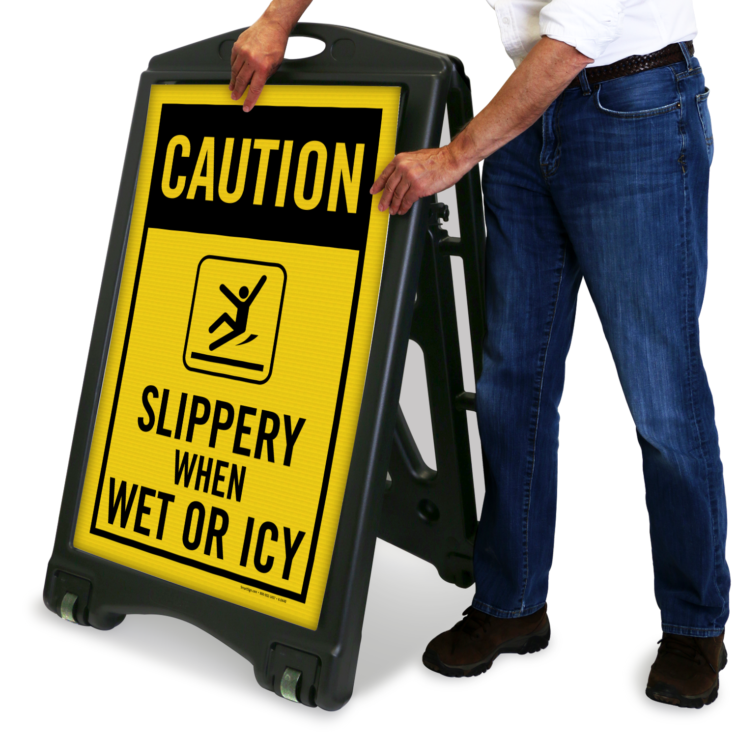Prevent pedestrians from slipping on a wet or icy floor. This A-frame rolling sidewalk sign comes with a slip trip graphic and is great for marking temporary hazards.