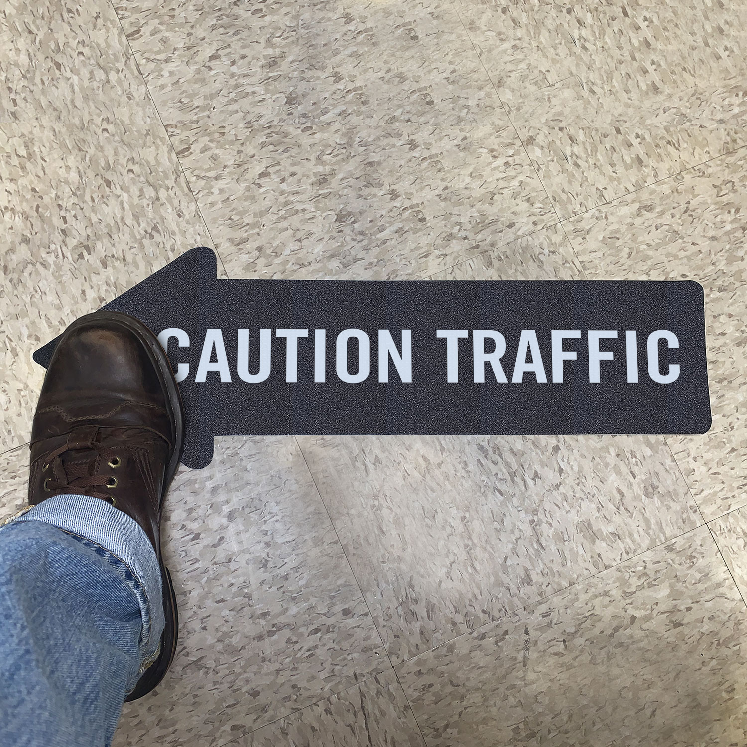 Caution Traffic floor sign is hard to ignore and easy to apply. It has a strong adhesive backing and stays in place once applied.