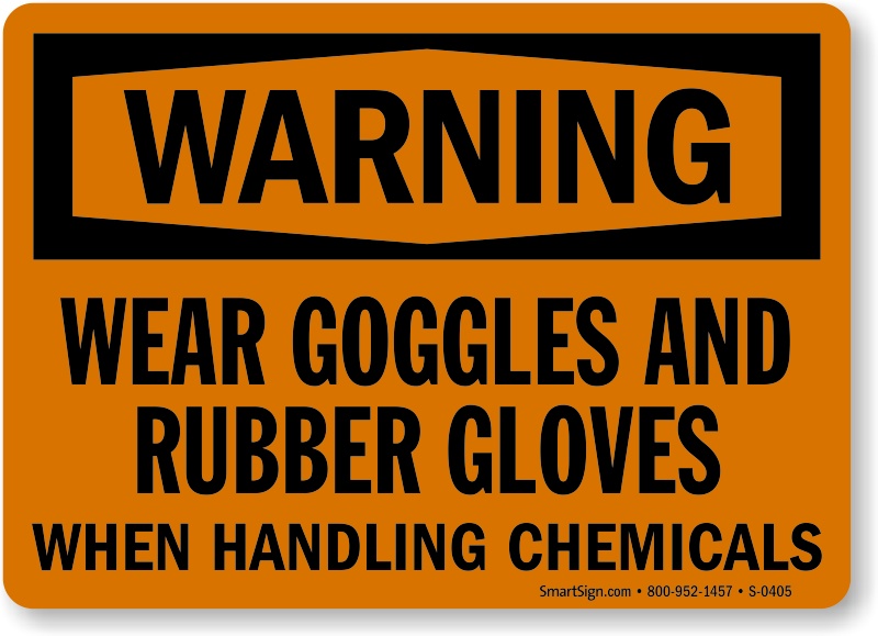 Don’t let accidental exposure happen. Use a "wear goggles and rubber gloves when handling chemicals" sign.