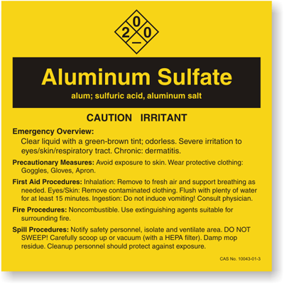 An Aluminum Sulfate chemical label will help prevent an avoidable and unnecessary accident. Nothing works better to increase safety than an Aluminum Sulfate label.